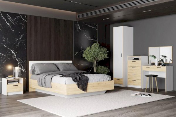 Изголовье кровати имеет элемент с мягкой обивкой, что придает ей элегантность и комфорт. Кровать с оригинальным парящим эффектом не только обеспечивает крепкий сон, но и облегчает уборку в комнате. Кровать оснащена также встроенным ящиком для белья, что позволяет оптимизировать место хранения.