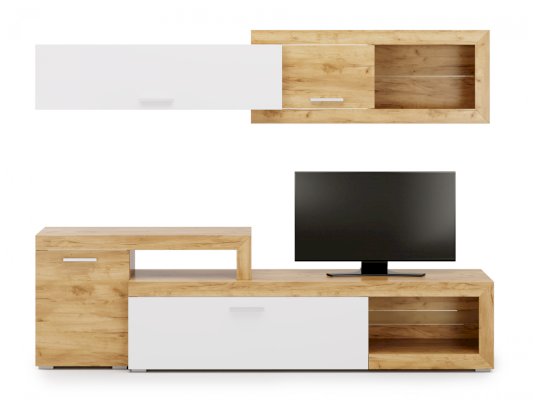 Преимущества: большая ниша для ТВ — для телевизора с диагональю от 50" и больше; стильное исполнение — насыщенный цвет натурального дуба делает мебель максимально привлекательной; настенный модуль — поможет сэкономить драгоценное свободное пространство в комнате, не пренебрегая практичностью. Для изготовления данной модели используется ЛДСП.