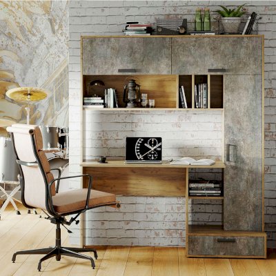 Письменный стол Техно – не просто стол, это готовое решение для организации рабочего пространства. В комплектацию входит столешница, верхние и боковые ниши, спрятанные за дверцы, нижний выдвижной ящик и открытые полки. Разместить необходимые предметы, включая технику, не составит труда. Цветовое решение позволит модели вписаться в современный интерьер, особенно в стиле лофт.