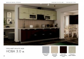 Кухонный гарнитур «Нова» доказывает, что простые вещи могут выглядеть дорого и эксклюзивно. Эффект элитарности достигается благодаря высокому качеству используемых материалов. Глянцевые поверхности смотрятся роскошно. Элегантная фурнитура и стеклянные дверцы подвесных шкафов делают комплект менее тяжеловесным и более утонченным.