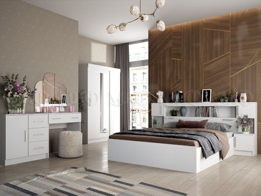В самом названии этой спальни видится что-то мягкое, удобное и уютное. Интересное и функциональное дизайнерское решение – кровать с надстройкой – служит дополнительным местом для хранения вещей.