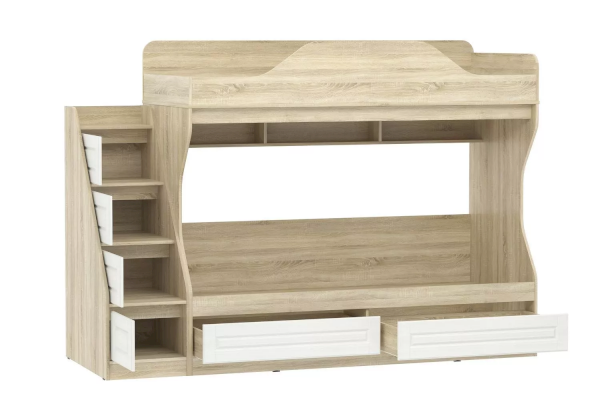 Двухъярусная кровать Оливия НМ 041.51 сэкономит свободное пространство в комнате, обеспечив спальное место сразу для двоих детей. Модуль оснащен книжной полкой и вместительными бельевыми ящиками, что позволяет использовать их в качестве дополнительного места для хранения вещей. Лестница, которая входит в комплект состоящая их четырех ступеней-ящиков дает дополнительное место для хранения для игрушек и детских вещей. Ограничитель без острых углов на верхнем ярусе, обеспечит ребенку безопасный сон.