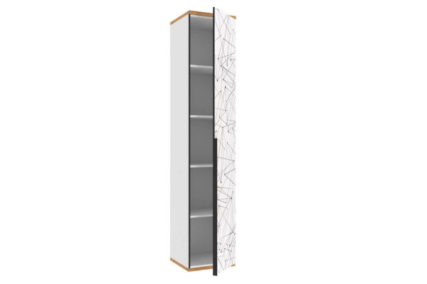 • За глухой распашной белой глянцевой дверью с рисунком 4 полки ЛДСП. Расстояние между полками 410 мм