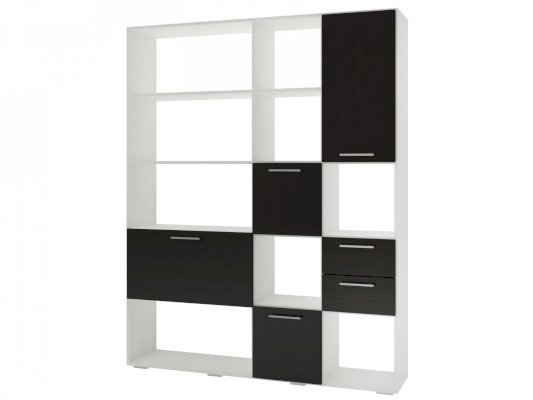 Применение задней стенки из ЛДСП (в ячейках с ящиками и фасадами) позволяет использовать данный стеллаж для зонирования пространства (чтобы предотвратить опрокидывание, необходимо обеспечить крепление стеллажа к стене).