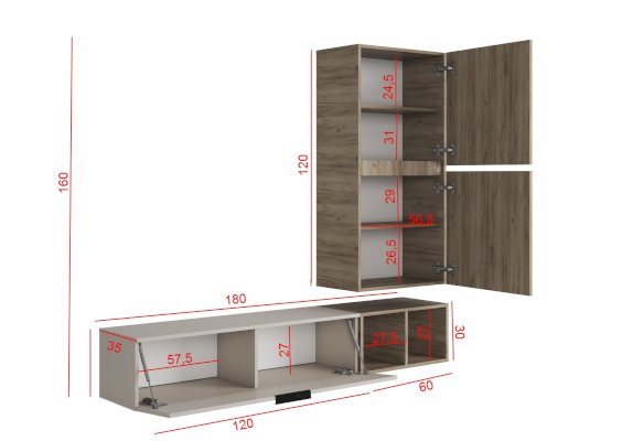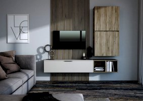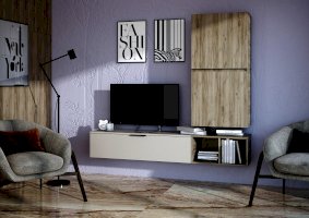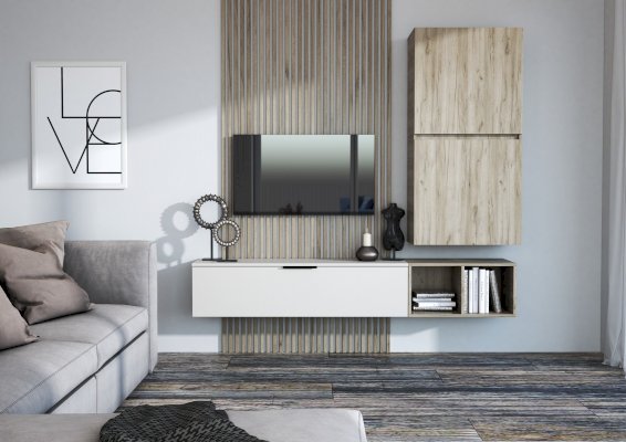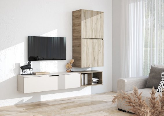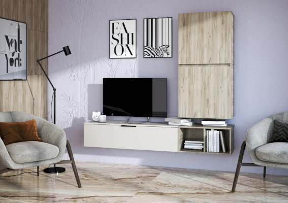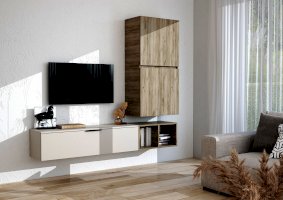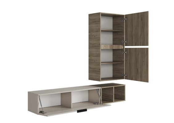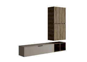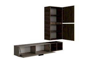Состоит из трех независимых модулей: навесного шкафа с 2-мя глухими фасадами, тумбы навесной и открытой полки.