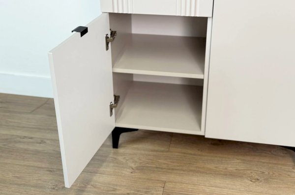 Дизайн комода продуман до мелочей: с одной стороны расположена глухая дверца, за которой скрывается просторное пространство для хранения. С другой стороны – ниша с открытой полкой, выкатной ящик и ещё одна глухая дверца, что позволяет гибко организовать хранение и поддерживать порядок в доме.