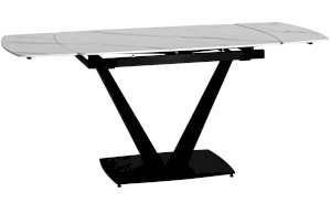 Лаконичный обеденный стол Клео с рисунком белого мрамора. Столешница из керамики отличный вариант для кухни. Материал знаменит прочностью и долговечностью, поверхность устойчива к различным внешним воздействиям. Компактный размер позволяет экономить пространство. Благодаря спрятанным по бокам элементам можно увеличить полезную площадь стола до 30 или 60 см. Металлический каркас черного цвета гармонично сочетается с цветом столешницы. Ножки V-формы надежно удерживают всю конструкцию. Основание каркаса оснащено заглушками, которые не позволяют металлическим частям соприкасаться с полом и портить покрытие при перемещении.