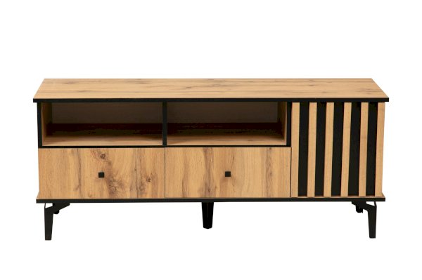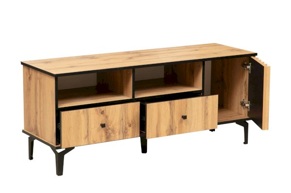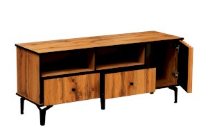 Даже если у вас нет ТВ, то тумба под ТВ должна быть обязательно! Ведь на нее можно поставить все, что захотите - большую плазменную панель, стереосистему или и то, и другое – габариты тумбы это позволяют! В дизайне поддерживается концепция асимметричности. Два отсека-близнеца: открытая полка и под ней выдвижной ящик плюс просторный ящик за распашной дверцей.