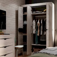 Трёхстворчатый распашной шкаф «Леонардо» с одной стороны имеет пять вместительных полок для белья, с другой стороны – удобную антресольную полку для хранения головных уборов, горизонтальную хромированную штангу для плечиков и нижнюю полку, в которой удобно хранить коробки с обувью. Особый шарм ему придаёт зеркало в полный рост, которое располагается на фасаде центральной створки. Сборка универсальна.