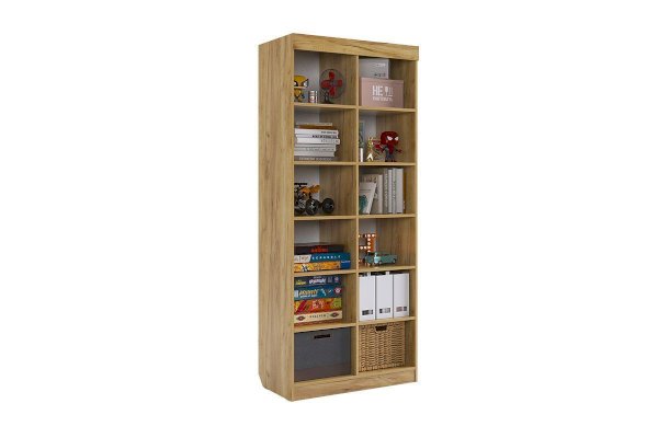 Стеллаж с открытыми и закрытыми полками идеально подойдет для книг, игрушек и мелочей.