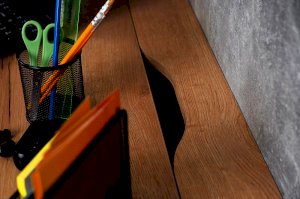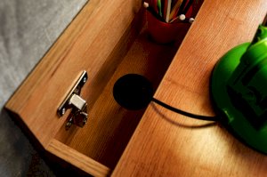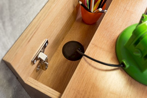 Стол отличается нестандартным решением для столешницы, которая максимально адаптирована для потребностей современных детей и работе на компьютере. Под откидной её частью, открывающейся за плавный вырез, прячется ниша для хранения и отверстие для вывода проводов, чтобы они не запутывались и не мешали ребенку.