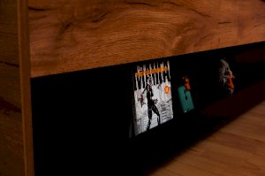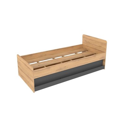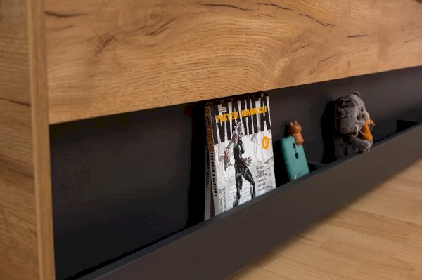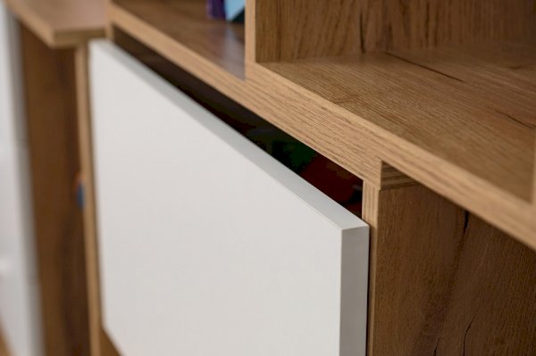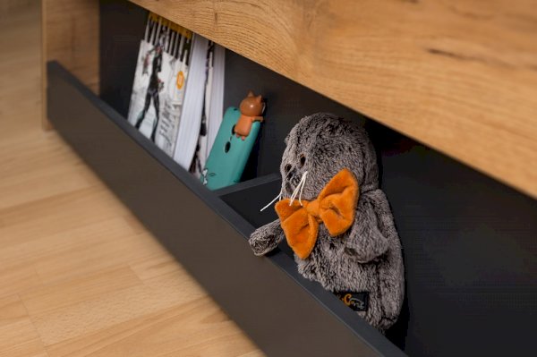 Подростковая кровать-тахта с большим выкатным ящиком на роликах, который можно использовать как место для хранения или как дополнительное спальное место. Он открывается за ручку-карман. Такой импровизированный карман дает возможность аккуратно сложить необходимые перед сном вещи: книгу, телефон, любимую игрушку.
