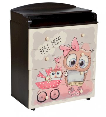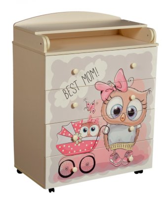 Пеленальный комод 800/4 Lilu 6 отличается привлекательным дизайном с использованием тематических детских принтов. В конструкции изделия предусмотрены 4 маленьких передвижных колеса, несколько вместительных ящичков на шариковых направляющих и откидывающаяся пеленальная столешница. Детский пеленальный комод, декорированный красочным рисунком, вмещает в себя постельные принадлежности, средства гигиены, распашонки, подгузники, игрушки, ползунки и другие личные вещи ребенка. Гладкая столешница идеально подходит для пеленания ребенка, а колесики позволяют быстро перемещать комод.