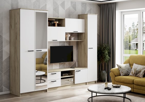 • Гостиная состоит из трёх модулей (шкаф платяной, шкаф бельевой, средняя секция), которые при желании можно устанавливать отдельно друг от друга, размещая в разных комнатах
