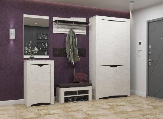 Криволинейная кромка – настоящее украшение модуля. Она существует как бы сама по себе, визуально «стекает» вниз, удивляя своей неординарностью и успокаивая мягкостью линий одновременно. В прихожей очень гармонично смотрится в дуэте с зеркалом.