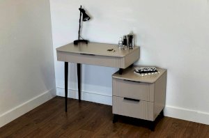 Представляем вам элегантный и функциональный туалетный столик «Катрин»! Этот предмет мебели станет стильным дополнением к вашей спальне и предоставит удобное место для хранения вещей, а также может использоваться как письменный стол.