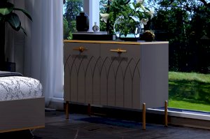 Купить комод в гостиную в современном стиле – практичное решение для вашего дома. Модуль создан не только для хранения, но и несомненно украсит пространство вашей спальни или гостиной. Сочетание мягкого серого оттенка силк анис, яркой золотой фурнитуры и кромки создает неповторимый образ респектабельной мебели.